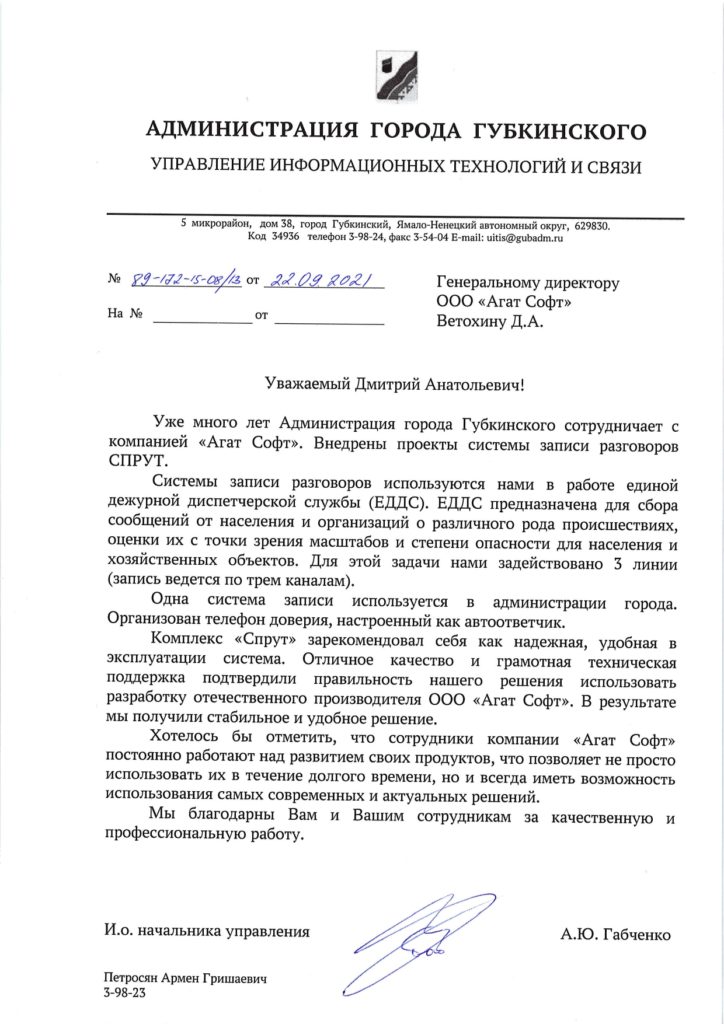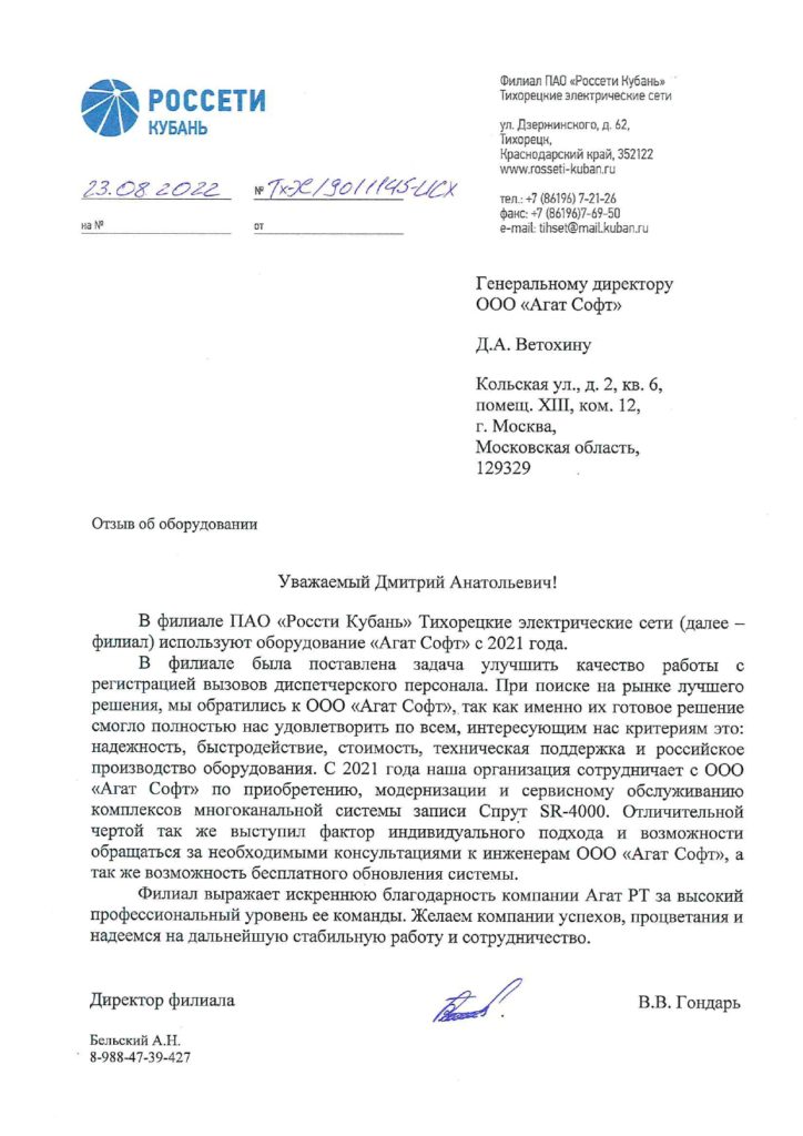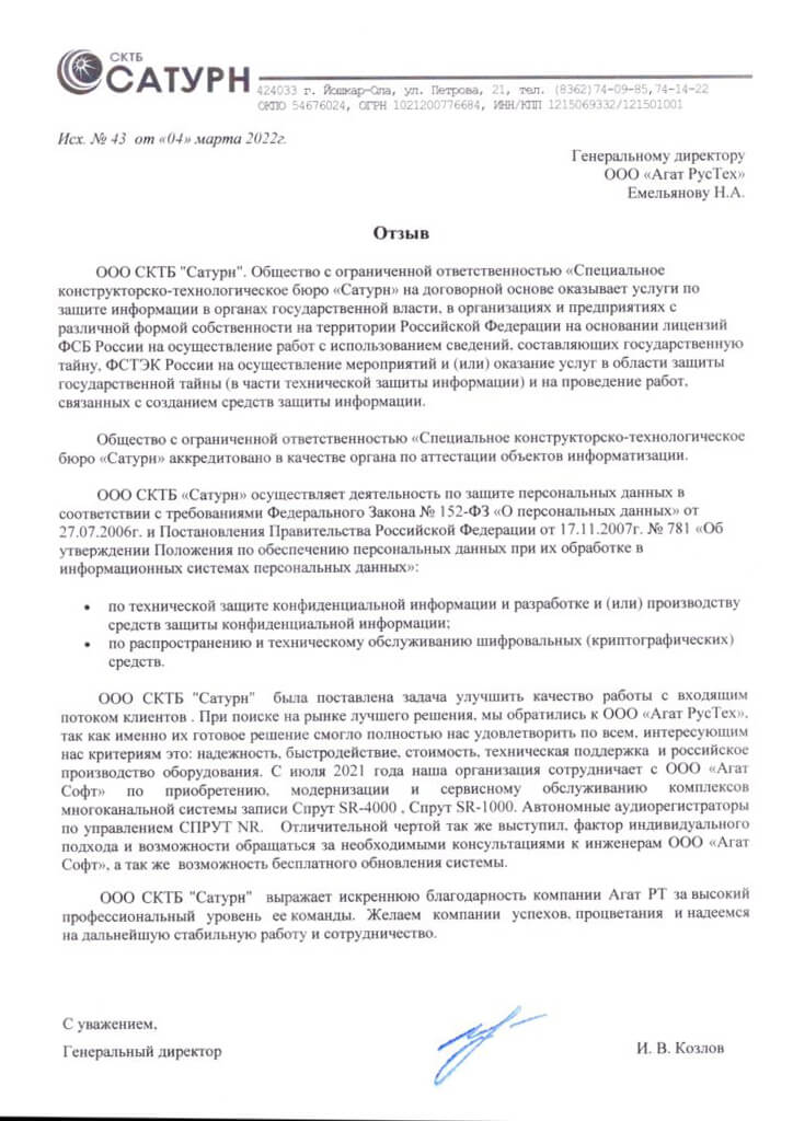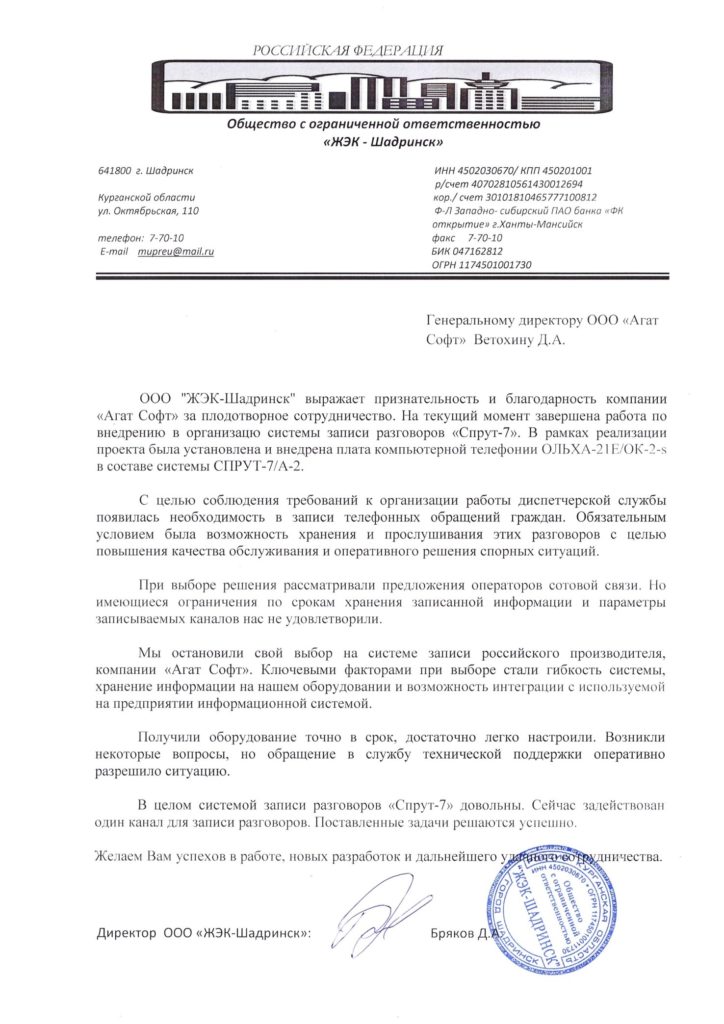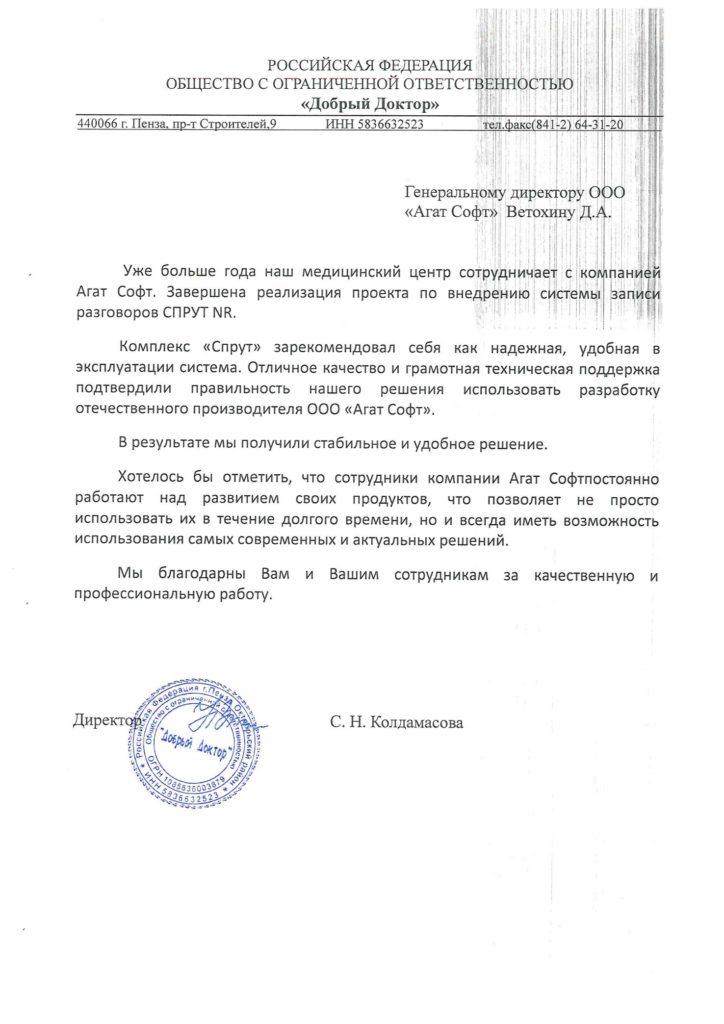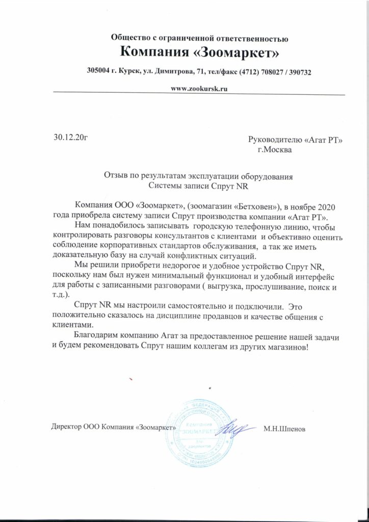 Отзыв от хозяйственного магазина «Хозяюшка» г. Воронеж о использовании системы записи переговоров Спрут-7