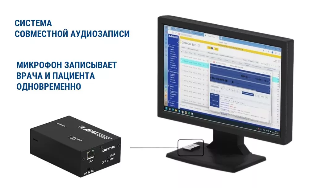 Комплект оборудования для совместной аудиозаписи разговора врача и пациента состоит из сетевого аудиорегистратора СПРУТ и 4-х двунаправленных микрофонов Stelberry MX-1181.